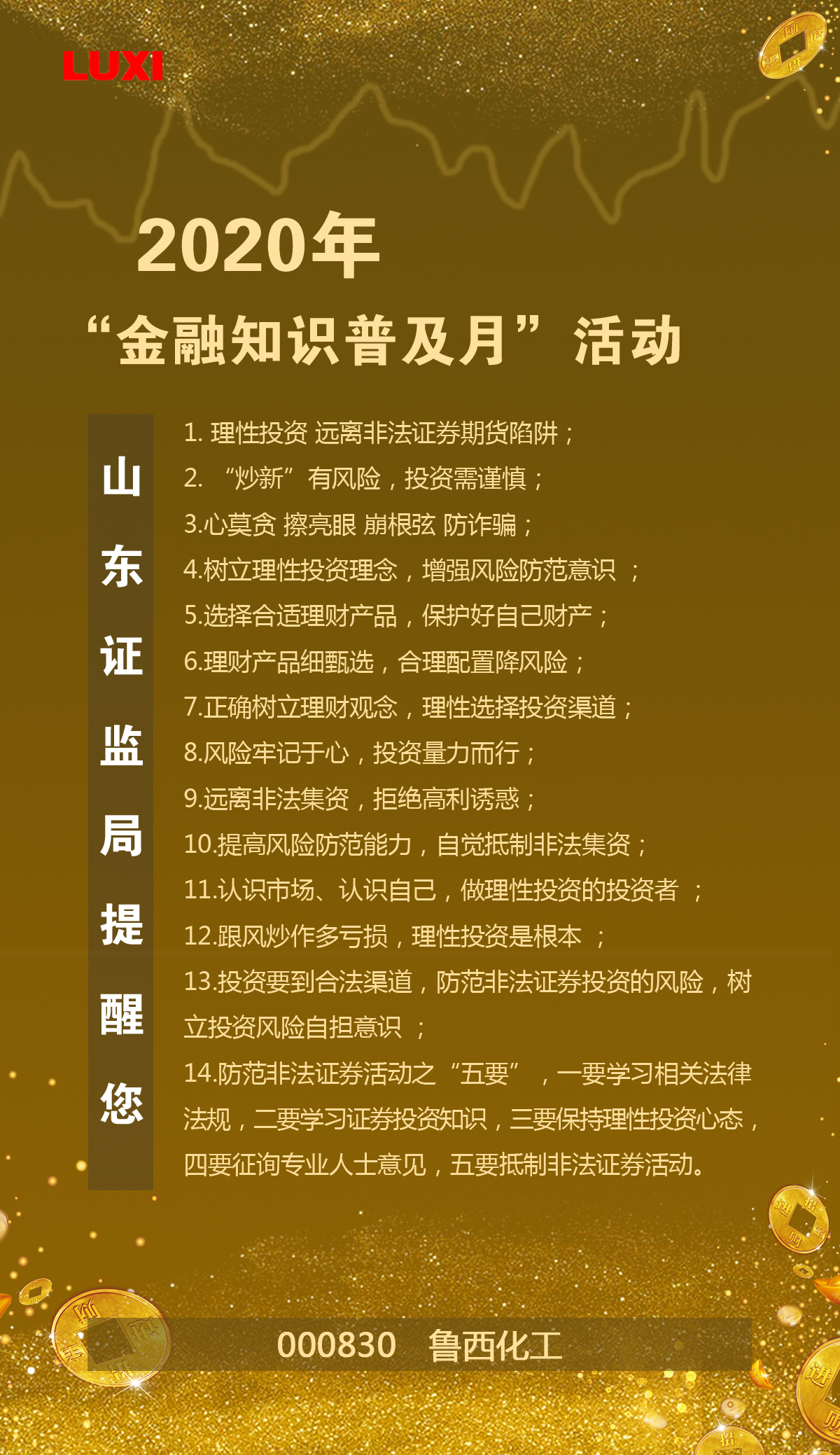 2020年“金融知識普及月”活動,山東證監(jiān)局提醒您:1. 理性投資 遠離非法證券期貨陷阱; 2. “炒新”有風(fēng)險,投資需謹慎; 3.心莫貪 擦亮眼 崩根弦 防詐騙; 4.樹立理性投資理念,增強風(fēng)險防范意識 ; 5.選擇合適理財產(chǎn)品,保護好自己財產(chǎn); 6.理財產(chǎn)品細甄選,合理配置