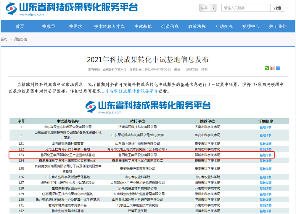 7月7日,山東省科技成果轉化服務平臺公布了2021年科技成果轉化中試基地,魯西化工集團聊城化工產業園中試基地位列其中。科技成果中試熟化是科技成果轉化的前提,為進一步精準對接科技成果中試市場需求,強化科技成果轉化全鏈條體系建設,2021年4月,山東省科技廳對山東省可開展科技成果轉化中試服務的基地信息進行征集。