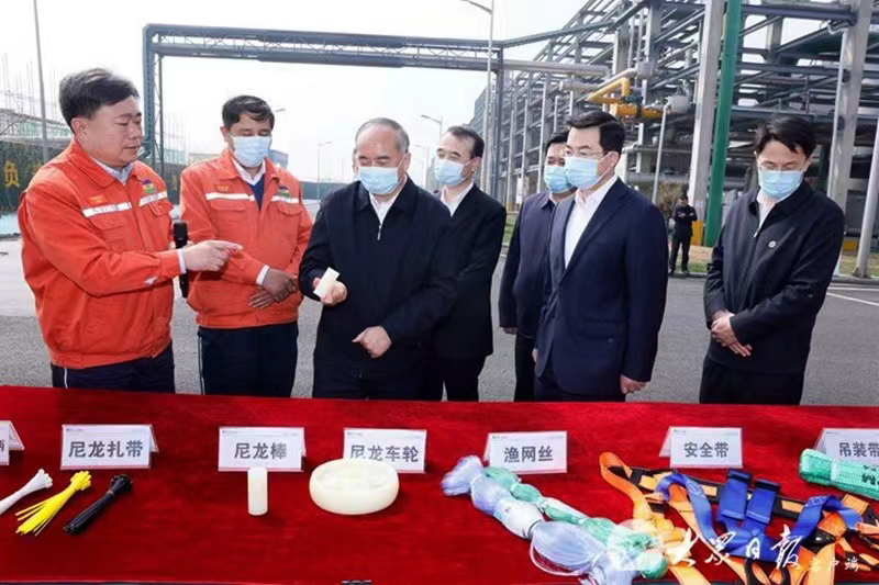 領導一行參觀了園區各生產裝置,并先后到己內酰胺/尼龍6項目、有機硅項目建設現場和運行指揮中心調研。參觀期間,張方向林武書記介紹了魯西集團在加快發展化工新材料,建設智慧園區、綠色低碳園區方面的做法和優勢,匯報了發揮中國中化整體優勢,加快發展高端領域用聚碳酸酯材料和推進二氧化碳化學利用方面的情況。