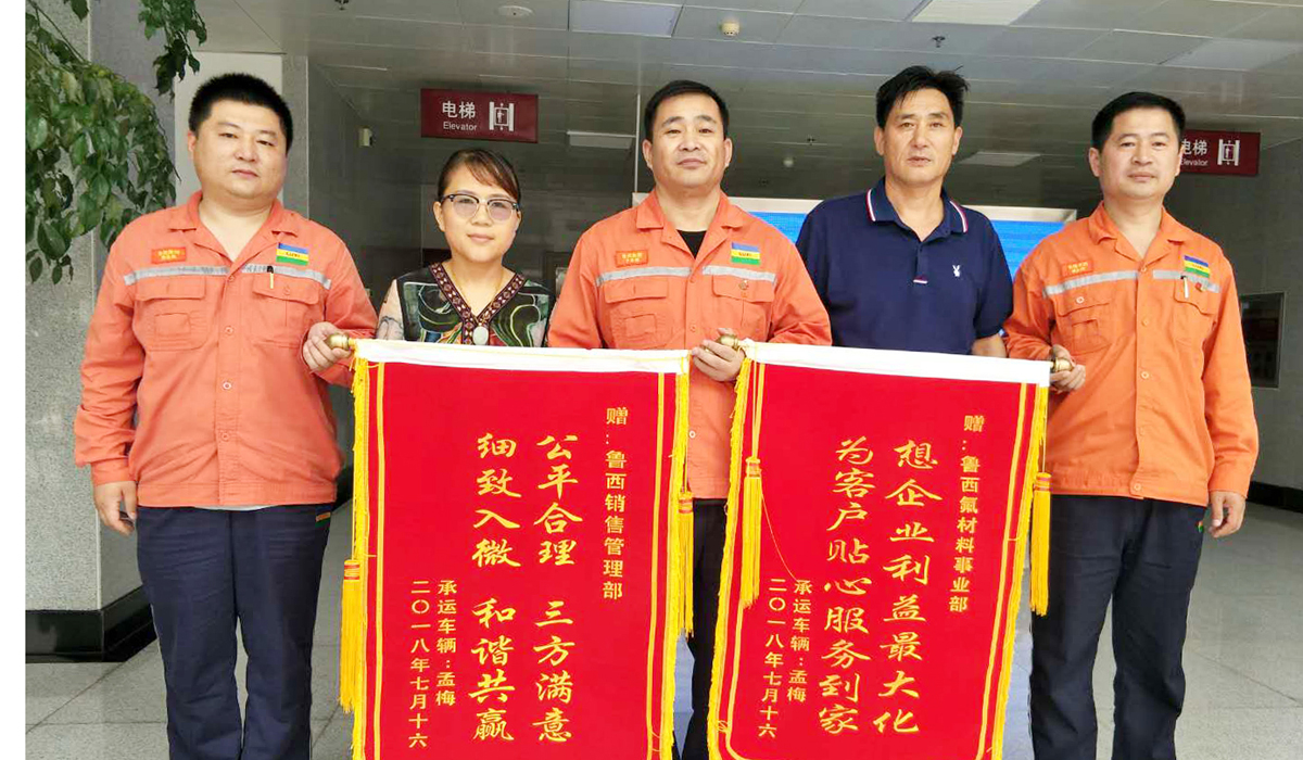 7月30日,東阿明鑫物流公司車輛負責人王長義、孟梅來到魯西集團,激動地將印有“公平合理 三方滿意 細致入微 和諧共贏”、“想企業(yè)利益最大化 為客戶貼心服務到家”字樣的兩面錦旗送到銷售管理部物流管理人員李登旭和氟材料事業(yè)部銷售經理楊先旗手中,連聲感謝。并向記者講述了一則魯西集團員工公平公正妥善處理虧噸事件的故事。