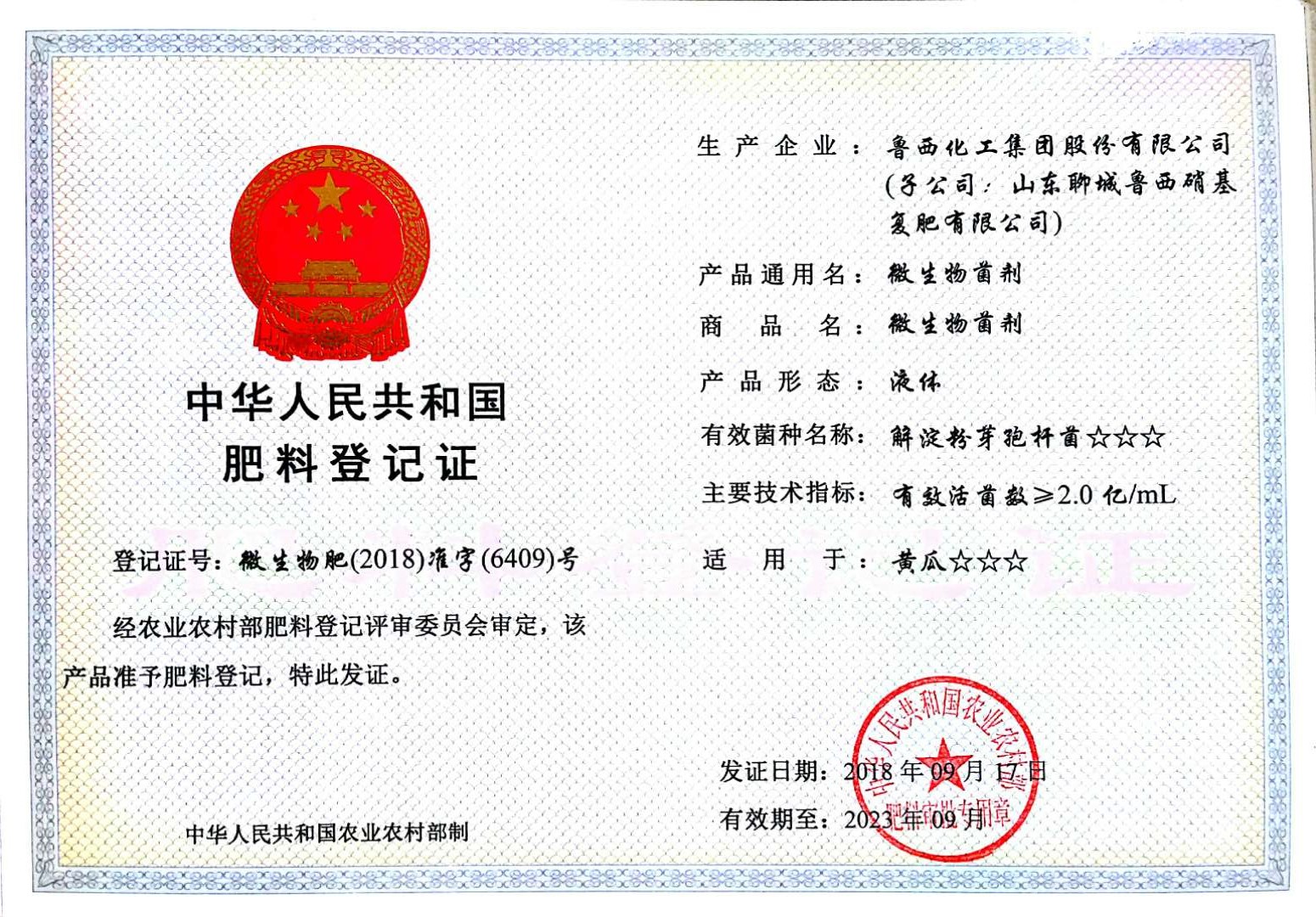 10月7日,收到了農(nóng)業(yè)農(nóng)村部肥料評審登記管理處寄來的魯西集團(tuán)農(nóng)業(yè)用微生物菌劑肥料登記證書,共涉及兩個(gè)菌種:解淀粉芽孢桿菌、多粘類芽孢桿菌。登記證號分別為“微生物肥(2018)準(zhǔn)字(6409)號”、“微生物肥(2018)準(zhǔn)字(6410)號”。登記證有效期至2023年9月。