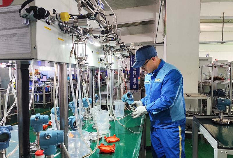 注油工序?qū)?ldquo;精打細(xì)算”發(fā)揮的淋漓盡致。硅油作為制作法蘭變送器的必需品,在注油方式未改進(jìn)前,每一臺(tái)變送器注油量的多少,只能根據(jù)人為的經(jīng)驗(yàn)去判斷,沒(méi)有確切的使用標(biāo)準(zhǔn),這就造成了制作前對(duì)硅油進(jìn)行加熱處理的用量很難把控。制作完成后剩余硅油含有雜質(zhì),不能二次使用,長(zhǎng)此以往,造成廢舊硅油的堆積。為解決這一瓶頸,注油臺(tái)增加抽濾瓶裝置,對(duì)剩余硅油利用抽真空方式進(jìn)行雜質(zhì)過(guò)濾,廢舊硅油得到了最大限度的利用。同時(shí)改進(jìn)注油方式,根據(jù)毛細(xì)管的長(zhǎng)度以及硅油密度計(jì)算出準(zhǔn)確的注油量。3米、5米、8米……各類型毛細(xì)管法蘭變送器的注油量得到了精準(zhǔn)把控,經(jīng)過(guò)改進(jìn)后,原來(lái)每月20公斤硅油的使用量,降低到現(xiàn)在的10公斤,并且利用率至少提高了50%。